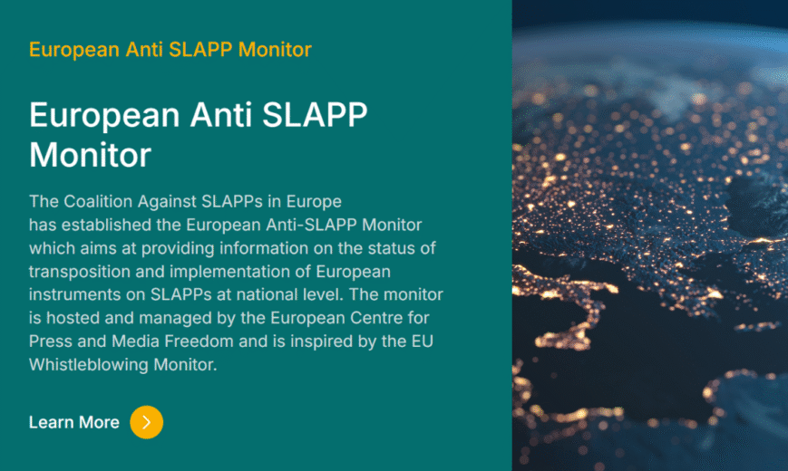 Koalicija protiv SLAPP-a u Evropi (CASE) i Evropski centar za slobodu štampe i medija (ECPMF) sa ponosom najavljuju pokretanje Evropskog anti-SLAPP monitora, nove onlajn platforme osmišljene za praćenje transpozicije i sprovođenja evropskih standarda o strateškim tužbama protiv učešća javnosti (SLAPP) na nacionalnom nivou.